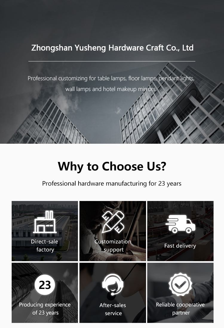 Zhongshan Yusheng Hardware Craft Co., Ltd. was established in 2000, formerly known as “Shengshi Lighting Accessories Factory”. It mainly produces hardware products such as lighting hardware accessories, makeup mirrors, telescopic tubes, telescopic joints, metal rocker arms, table lamps, floor lamp accessories, and various lamp tube products, providing customers with structural design and production services.